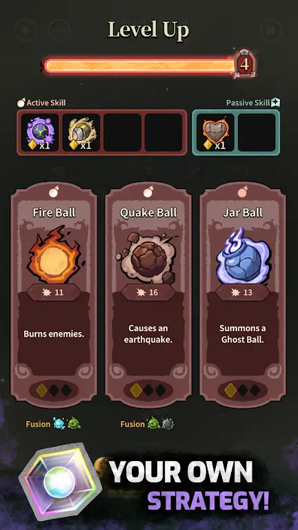 2. 丰富的策略系统与Roguelite元素融合:将弹珠射击玩法与Roguelite系统深度结合。每一波怪物防守结束后,玩家可从随机的技能和增益选项中挑选升级,增强弹珠威力提升攻击速度或获得特殊状态效果。游戏关卡变化多端,没有两局相同的体验,策略规划与运气元素交织,让每场战斗都充满新鲜感和挑战。