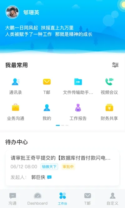 软件功能丰富。任务和汇报草稿自动保存云端,搜索功能精准高效。音视频通话支持单聊群聊,快捷呼叫方便远程沟通。工作台集中展示核心工作场景,重要功能一触即达。