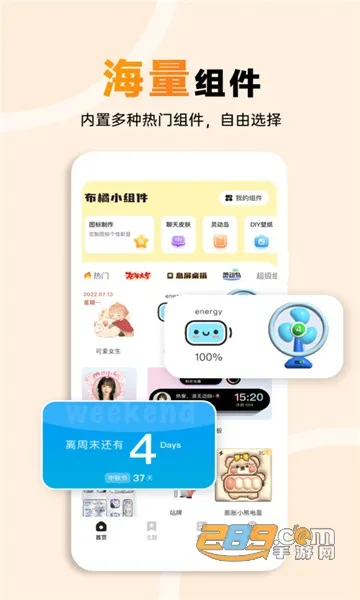 1、素材丰富:拥有海量组件、优选主题、高清壁纸,涵盖多种风格类别,满足不同审美需求,可自由挑选搭配,轻松美化桌面。
