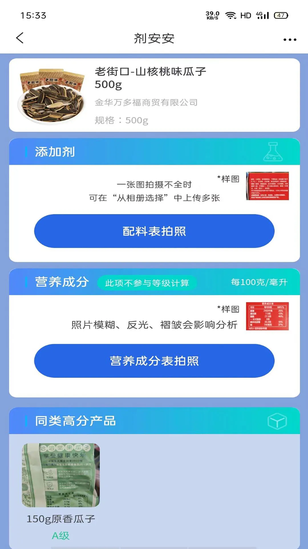 剂安安是深圳市剂康科技有限公司开发的食品安全检测查询应用。能扫描食品条码,展示配料、添加剂、营养成分等信息,划分添加剂等级,提供知识新闻,免登录无广告,操作简便,助用户放心购物 。