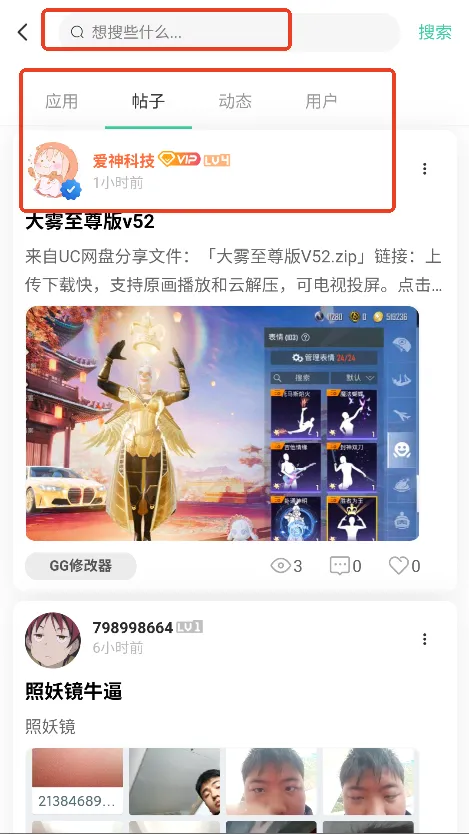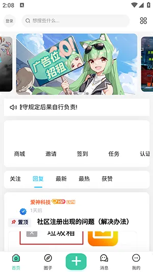 爱神社区是面向安卓玩家与创作者的交流分享平台。首页有搜索与公告位,中部卡片流展示新帖与热门回帖。