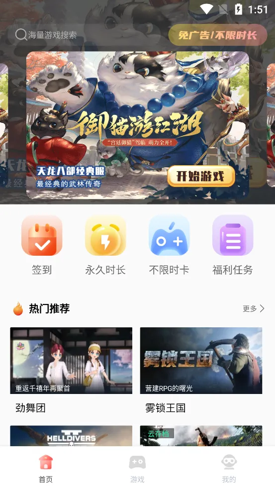 **功能贴心福利多多**:自动云存档,游戏进度实时同步,不用担心数据丢失;还提供丰富游戏福利,新用户注册送免费时长,每日签到、做任务也能领。同时,针对移动端定制虚拟游戏控制器,自定义按键设置满足个性需求。