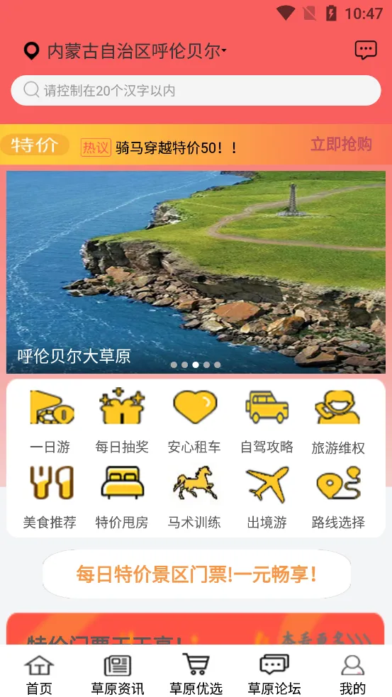 福利方面,每日转盘抽奖能轻松赢得特惠票,天天有特价票抢购。还有真人客服一对一服务,解答旅游途中各种问题。同时有团餐优惠、自驾游小众景点攻略、本地美食推荐等,致力于让游客在呼伦贝尔的旅行更加愉快便捷,享受独特旅游体验。