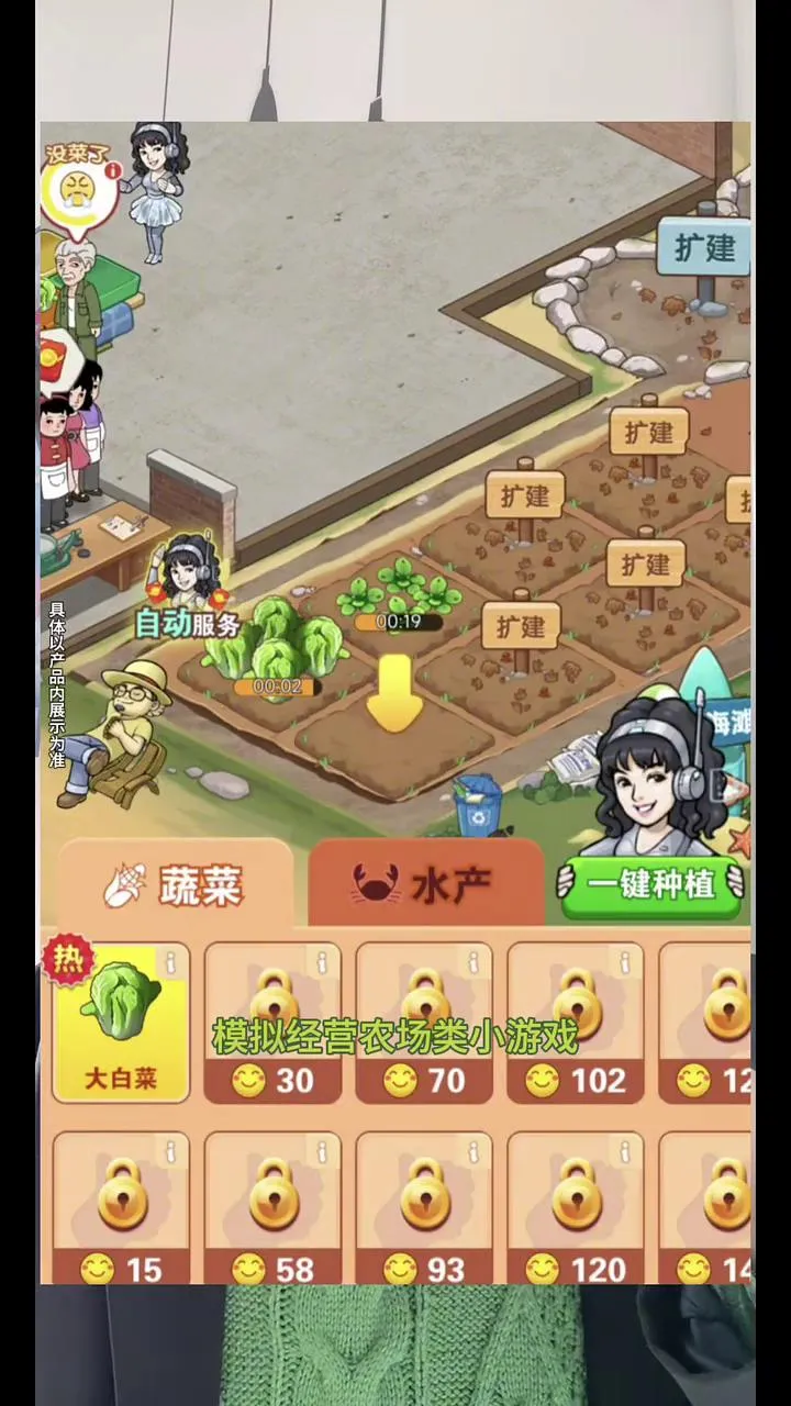 在游戏中,能体验到多样玩法。可自由开垦田地、种植作物、收获售卖,获取收益。蔬菜种类丰富,需不断解锁。还能设置种植区域,定制经营策略提升蔬菜质量。并且加入挂机系统,解放双手。