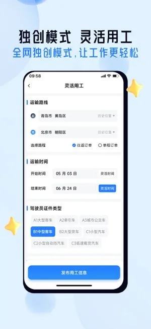 2、模式灵活:独创灵活用工模式,一单一结,工作更轻松,货运服务时间灵活供用户选择。