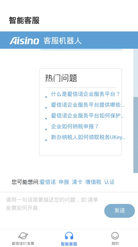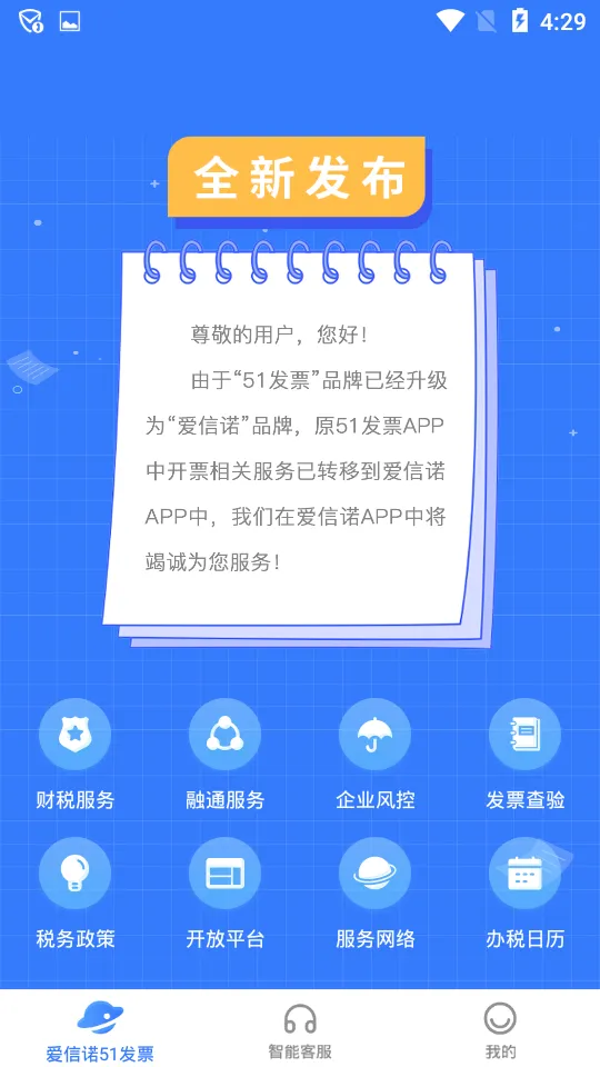 爱信诺51发票是基于航天信息51云开票平台的移动开票软件。它由51发票升级,带来更好体验。