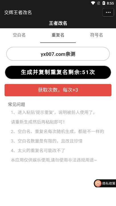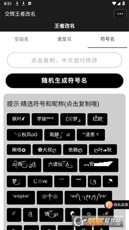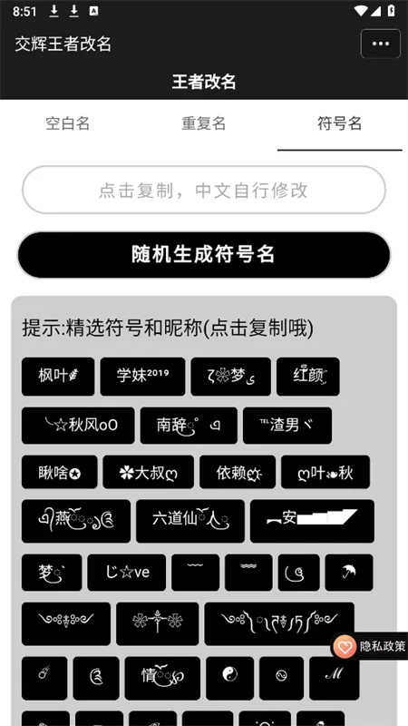 在功能方面,它能快速随机生成各种风格名字,有空白名、重复名以及符号名生成功能。玩家输入想要的名字,点击生成就能获得全新未用昵称,还能生成多种符号组成的特色名称。比如一键生成空白昵称,让玩家在游戏中有独特隐形名字效果。