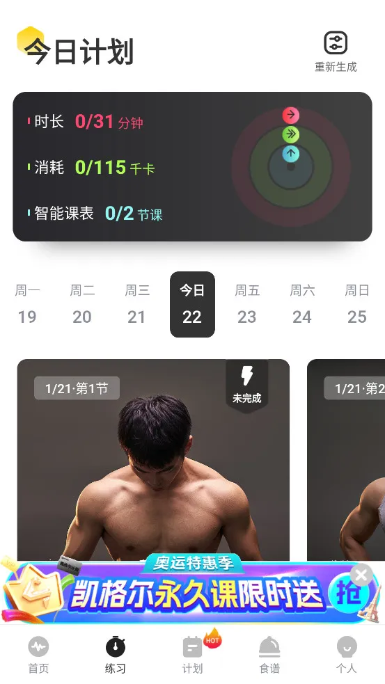 2、定制专属计划:利用AI算法结合多种运动,依据用户目标和个人情况,定制21天专属健身计划。