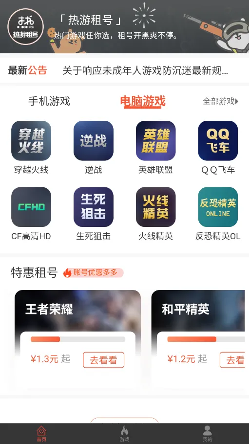 热游租号是广州嘟帆网络打造的游戏账号租赁软件。汇聚海量热门游戏账号,价格优惠,租2小时送1小时。具备一键上号、即时提醒等功能,交易安全可靠,流程便捷,还有新人红包等福利 。
