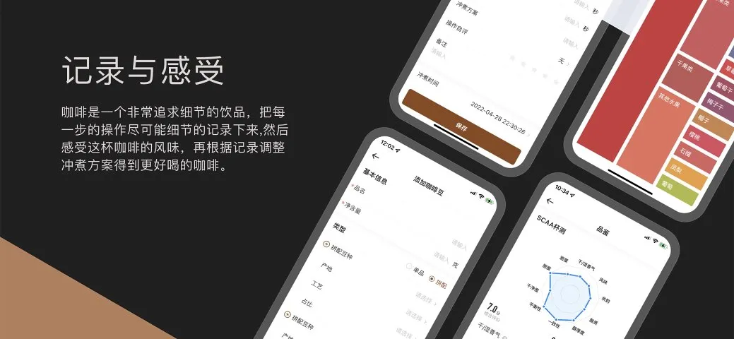 其亮点众多。内置SCAA标准风味轮,点击辨别风味后用可视化图表呈现杯测结果;整理出109种感官评估词汇的咖啡感官词典,助您描述风味。磨豆机模块可管理多个磨豆机,针对不同场景和咖啡豆设置参数;冲煮器具模块按四大类区分,能定制冲煮参数。