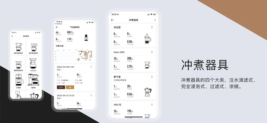 4、统计清晰明了:强大的统计模块可归集计算冲煮记录,关联器具、磨豆机、咖啡豆,精确算出杯成本,展示设备使用情况,助您喝得明白。
