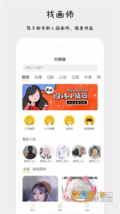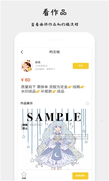 2 资源丰富:包含海量优质画师,每天都有新入驻画师,有头像Q版、人设立绘等多种类型约稿可供选择。