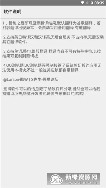 其特色明显,**无界面不占内存**,复制即可翻译,悬浮窗消息提醒,长按复制、点击取消操作便捷。采用谷歌翻译 2.2 版且无次数限制,有道翻译作为备用,支持韩、日、英等语种的英译汉和汉译英。