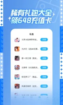 该平台福利众多,不仅能免费领取BT福利号、高级氪金账号、满V特权号等,还有新人免费首充、无门槛神券。高级礼包包含648充值卡等高价值物品。而且,玩家可免费领取道具号,上线即享满V无限元宝、变态爆率。