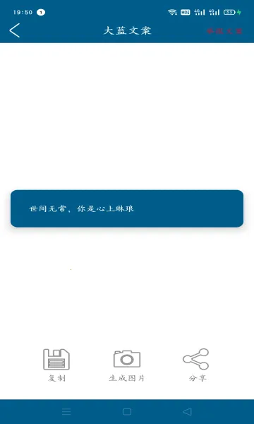 大蓝文案是一款娱乐文案软件,有上百万条免费文案,分类细致,涵盖恋爱、抖音等多维度。搜索强大,支持一键复制。还新增九宫格图片批量保存,能收藏灵感,助你轻松发圈,解决文案困扰 。