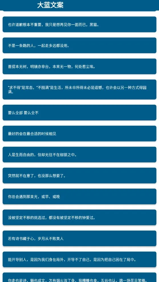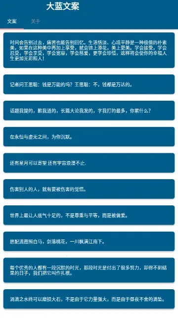 大蓝文案是一款主打文案的娱乐软件,能为用户提供写文案的灵感。