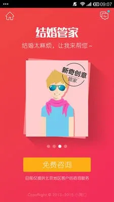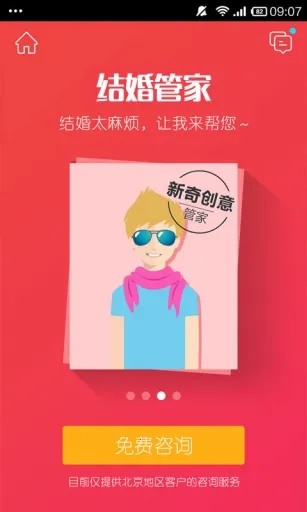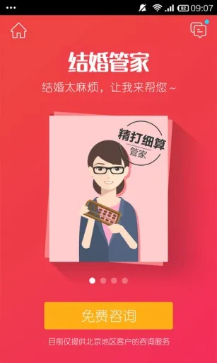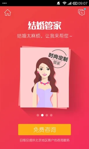 结婚管家2025是一款致力于为用户提供贴心婚庆服务的软件。目前仅针对北京地区客户提供咨询服务,外地服务正在筹备中。