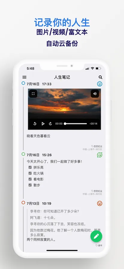 2、记录形式多样化:支持以文字、图片、音频、视频等多种形式留存生活点滴,构建丰富的人生轨迹档案。