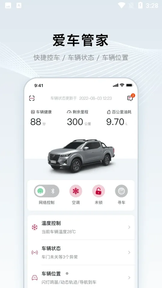 在功能方面,表现十分出色。**车辆位置**功能可精准定位并提供寻车路线指引,找车更便捷;**车辆状态**能实时显示车门车锁开闭状态,用车更安心;**智能安防**开启电子围栏,随时监控爱车安全。还有温度控制,能远程开关空调并设置温度;车辆健康检查,可查看胎压、刹车等部件健康状态。
