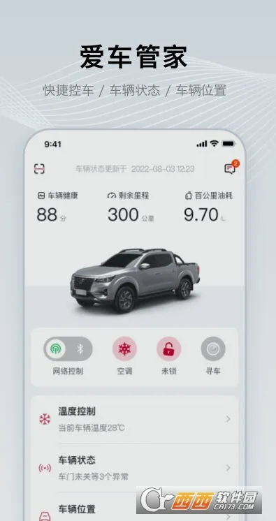 2、车辆信息全掌握:能显示车辆车门、车锁等开闭状态,还可检查爱车胎压、刹车系统等部件健康状态,全面了解车辆状况。