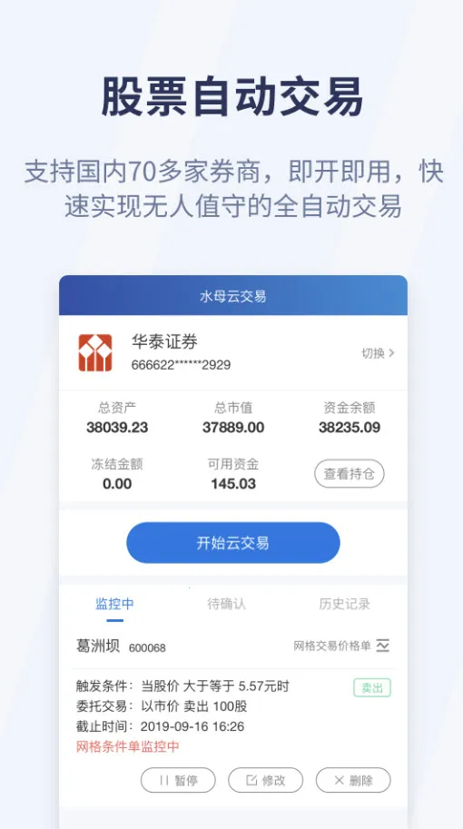 2、合作广泛:与国内70多家券商合作,支持股票自动交易,安卓版能快速实现无人值班全自动交易,即开即用,十分方便。