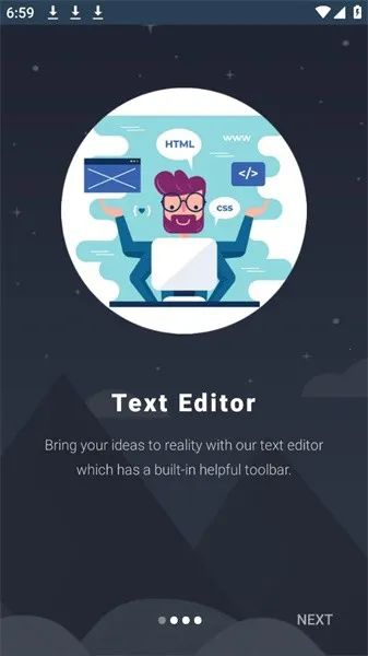 3、轻松创建与导出项目:允许使用应用内浏览器HtmlViewer轻松创建HTML网页设计,还能在项目结束或日程方便时,将项目导出到喜欢的任何设备。