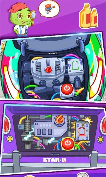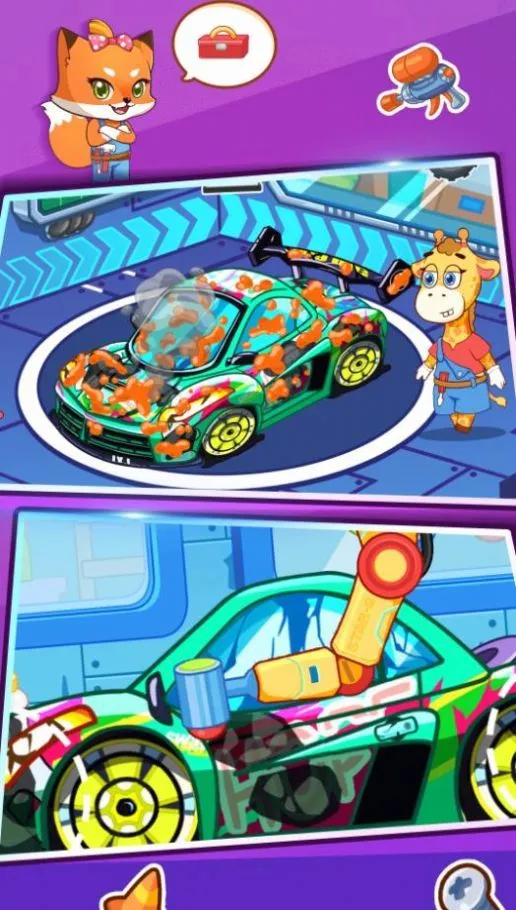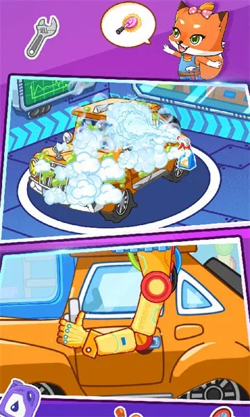 在玩法上,有多种有趣的体验。比如轮胎更换,操作奇妙千斤顶卸下旧轮胎,翻新车轮,防止出门打滑;快乐洗车,用强力洗洁精、高压喷水枪等道具全面清洁汽车,让污渍消失;紧急修车,修复凹凸不平的车身、碎裂玻璃和摇摇欲坠的车把手;车辆保养,为冒烟的汽车引擎换电池、加油。完成任务后还能和伙伴击掌庆祝,迎接新挑战。