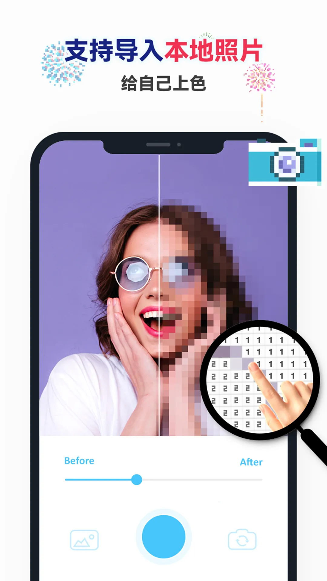 玩法简单易上手,操作简捷,双指可放大缩小彩色图片,长按能连续着色。还有丰富的涂色道具,如油漆桶、魔法棒、炸弹、提示工具等,助你快速完成像素作品。完成的作品可保存成动画视频,分享给家人朋友。