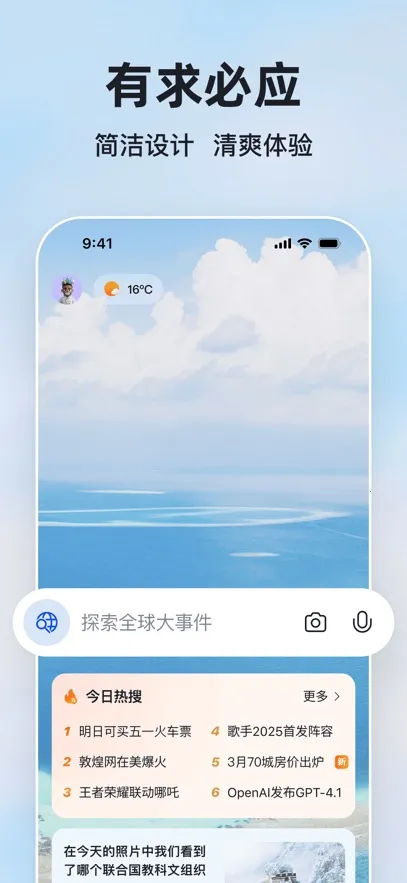1、精准智能:能迅速捕捉用户搜索习惯,推荐各类生活资讯;提供快速智能答案,如搜索简单数学问题可直接在页面出答案;还能精准追踪热点趋势,满足多样化信息需求。