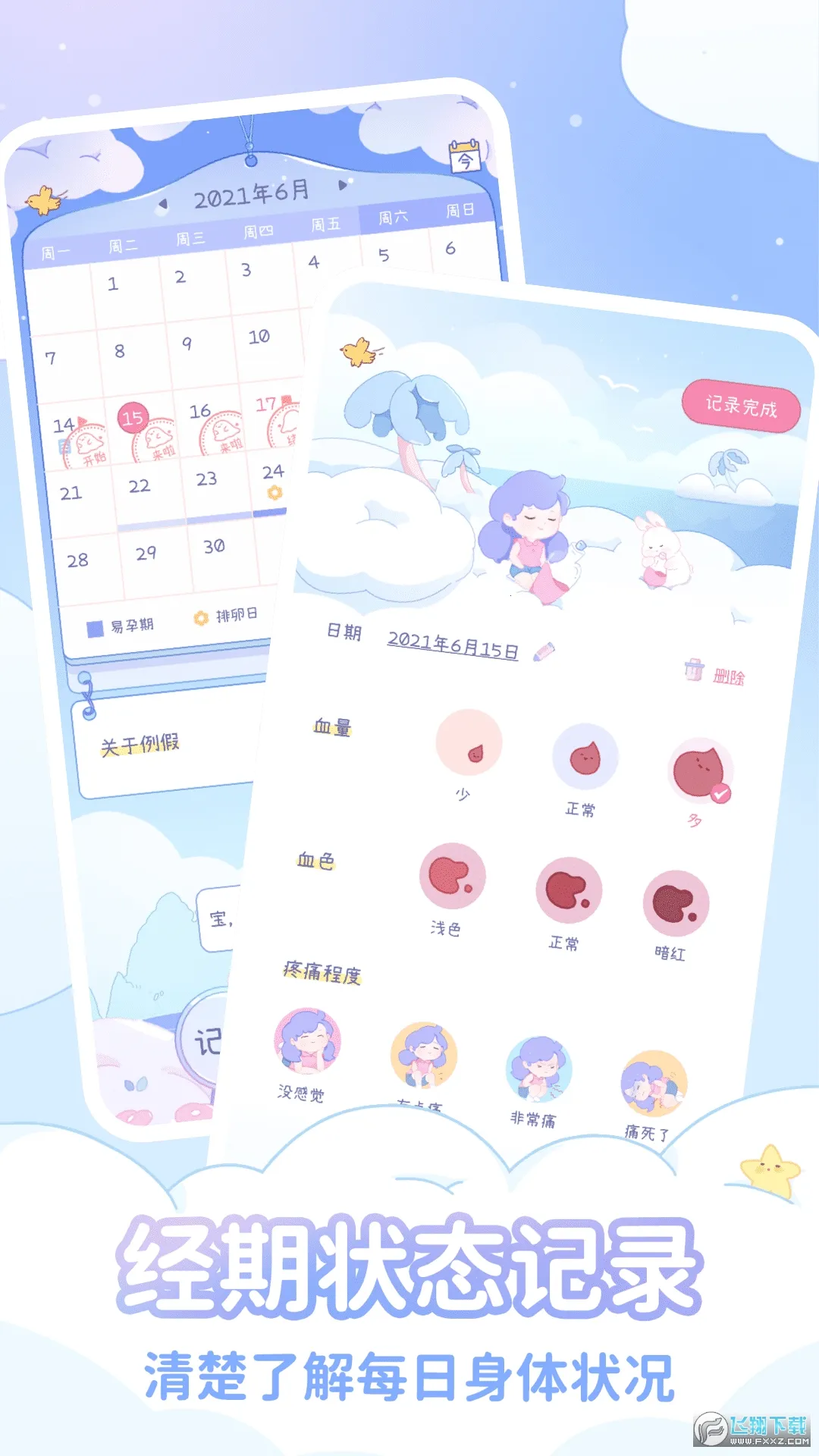 3、智能预测免尴尬:智能预测经期,记录提醒,避免经期尴尬,还能体贴经期每个细节,如心情、爱爱习惯等。
