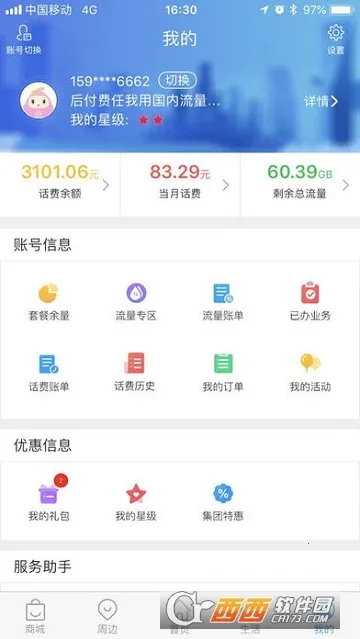 账号信息方面,包含套餐余量、流量账单、话费账单等,能让用户清晰了解个人套餐使用明细。优惠信息中,有我的礼包、星级权益和集团特惠等。服务助手提供邀请好友、业务办理、号卡激活等功能。