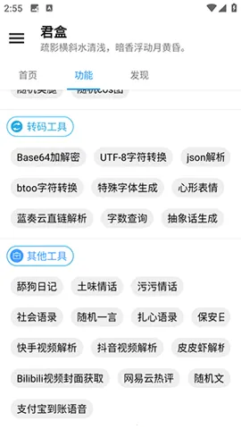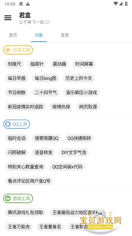 君盒是一款实用的工具箱应用。它有诸多优点,首先使用便捷,无需登录或注册就能直接使用众多实用工具,还能将常用工具以快捷方式放在桌面。进入 APP 后,功能板块清晰,可通过底部菜单或顶部搜索框快速定位所需功能。