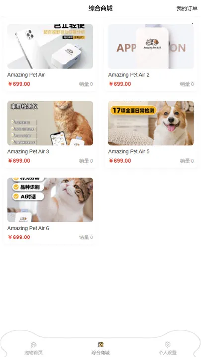在购物方面,点击底部导航栏的综合商城,进入商城页面后点击 AmazingPetAir 商品,进入产品详情页点击购买按钮,填好收件人信息、选好支付方式并确认,即可完成下单。