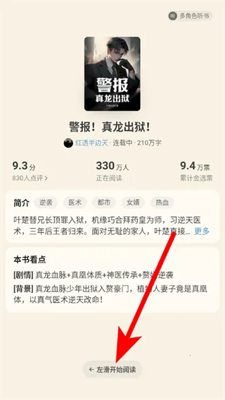 2、在小说详情界面,点击左滑开始阅读选项,进入小说阅读界面。