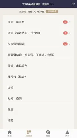 用户进入软件可选择题库类型,练习精选题目,学习英语知识。还能管理错题本,分析薄弱项针对性学习。此外,支持自定义创建新题库,依据薄弱项强化练习。总之,英语刷题宝是获取海量题库、轻松学习英语的刷题神器。