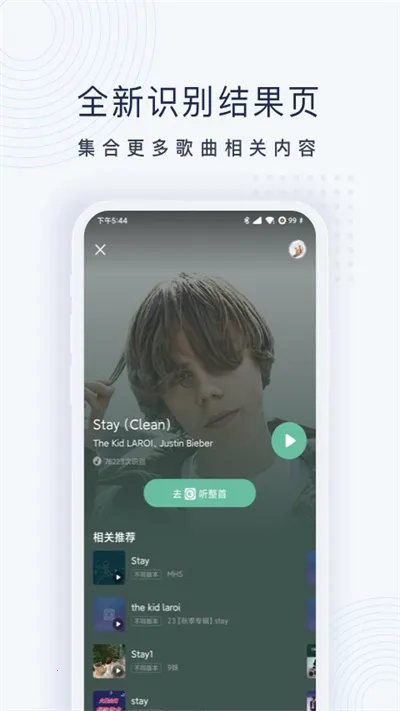 2、识别精准又快速:采用酷狗自研的识别算法,能快速准确地识别歌曲,最快一秒就能识别出相应音乐,还能精准推荐相似歌曲和歌手,让你发现更多好音乐。