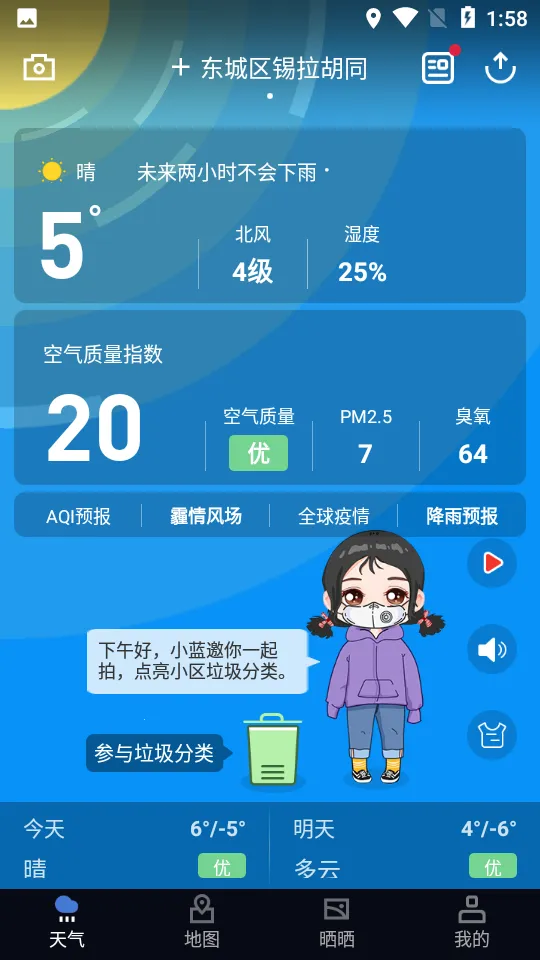 此外,它还有很多贴心之处。提供24小时内天气预报和未来一周天气趋势分析,还有口罩佩戴、运动等生活服务提示。你还能在社区分享出行心得、美景等。有了蔚蓝地图,出行和了解环境信息都变得轻松又方便。
