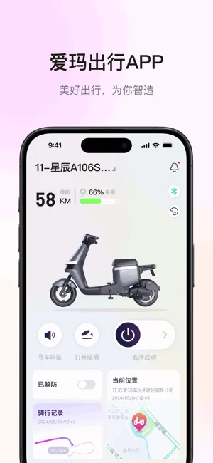 它专为爱玛电动车用户设计,让用户不受钥匙限制,带来全新出行体验。用户可在线查询行程轨迹,还能智能定位周围停车点。绑定车辆方式多样,可扫码、手动输入激活码或车架号。