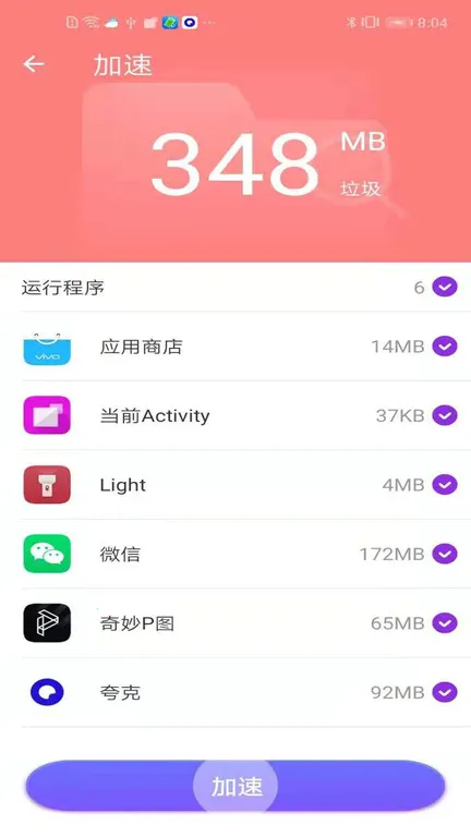 3、一键加速可关闭不使用的后台程序,提高手机速度,清理内存,有效解决手机卡顿、耗电、内存不足等问题。