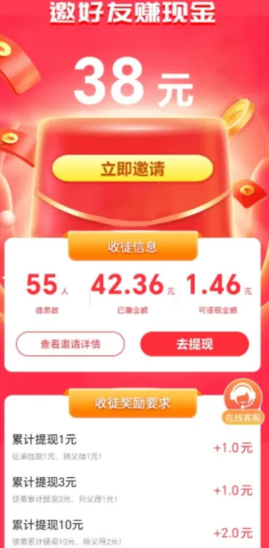 3、提供邀请好友功能,通过邀请好友加入可以获得额外的现金奖励,轻松赚取收益。