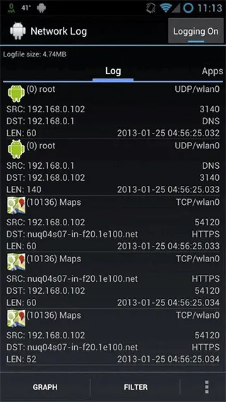 想知道网络日志怎么查看?网络日志app就能帮到你!它是一款超实用的网络监控软件,能帮你详细了解手机流量使用情况。打开软件,就能知晓各软件使用网络的状况。还能通过过滤器查看结果,长按软件可控制其行为。特色功能丰富,触摸应用能查看连接时间线,选择菜单项可看所有应用整体时间线,统计数据间隔时间能在1毫秒到48小时调整,缩放、滑动图表超方便。软件功能强大,有实时记录显示、网络使用统计、连接通知等。亮点包括活动网络吞吐速率、上次连接时间戳等。能形成科学的流量消耗排行榜,怀疑流量使用异常时,用它测试超靠谱,让你对手机流量使用情况一目了然,轻松管理流量。