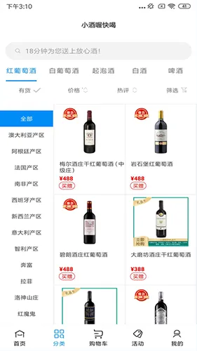 2. 优惠福利多多:定期推出限时折扣、满减优惠、买赠活动等,还有领券中心可免费领取大额优惠券,新人注册专享四折优惠,让你以实惠价格购高品质酒。