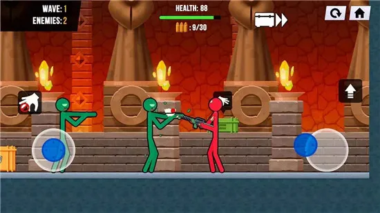 新手玩法简单易上手,进入游戏有多种模式可选,闯关模式关卡众多,完成条件和难度各异。控制方面,左边管移动,右边控制武器攻击方向与跳跃,完成关卡条件就能通关获金币奖励,用以购买更多火柴人。