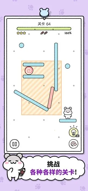 游戏玩法简单易上手,操作小仓鼠通过一个个关卡。关卡类型丰富,是开动脑筋的益智关卡,画线让仓鼠吃到糖果这一设定很有创意,增加了游戏的趣味性。完成关卡后可收集不同可爱仓鼠,还能解锁各种超萌的毛绒小球。