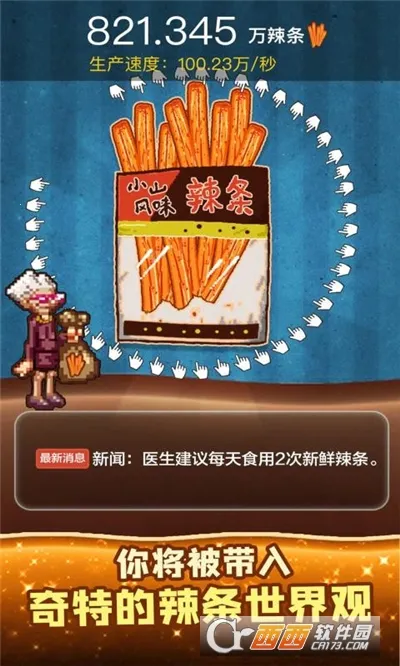这游戏玩法简单又好玩,点击屏幕就能获得辣条,点得越快,辣条越多。你还能升级生产线,加速制作,解锁新工具。游戏里有400个成就、600个解锁物品、超1000个词条,能带你感受独特的辣条世界观。各种有趣事件不断,还有新奇的新闻剧情。画面是复古像素风,人物形象很有特点。你能经营工厂,生产各种辣条,外销到全世界,掌控辣条命运。不管你是想体验经营乐趣,还是感受奇特的辣条世界,这款游戏都能满足你,快来试试吧!
