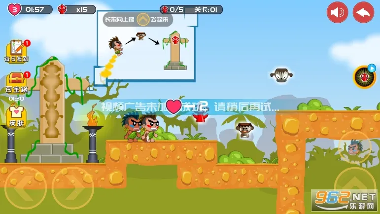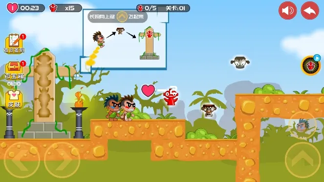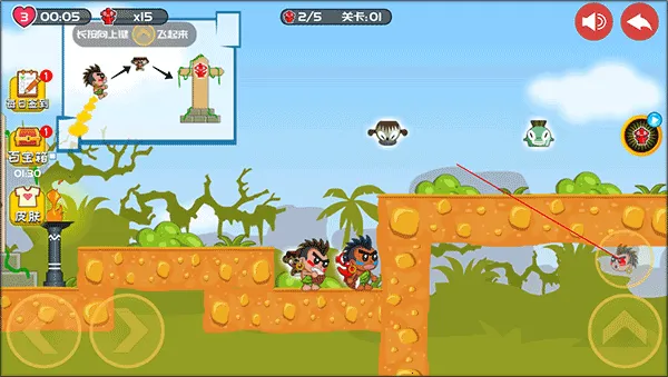 游戏里,原始人兄弟杰克和东尼因村庄图腾失踪,踏上寻找图腾下落的旅程。一路上要小心各种陷阱、野兽和食人族,利用放屁的独特本领和机关道具拿回所有图腾。操作很简单,通过控制放屁来操作角色前进速度和方向,点击头像还能换角色。