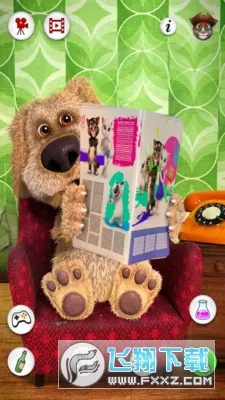 游戏画面Q萌可爱,狗狗本形象逼真,动态模拟生动,视觉风格清新简洁,音乐音效增强氛围。其玩法继承了汤姆猫系列。玩家能实时和狗狗交流互动,戳拍它的不同部位会有多样表情变化。还能让它制作饮料、看报纸、吃东西,通过食物喂养改善其心情。按下电话按钮可通话并录制视频分享,按下化学按钮能带去实验室混合试管观察反应。