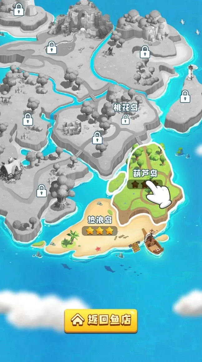 玩法丰富多样。能在海边溜达找海鲜,还可开船去不同岛屿抓鱼,各岛鱼种类不同。操作简单,选好工具点击就能抓,抓到的鱼需扔桶里才有效。抓到的鱼能养着或卖钱,赚金币买更好工具。