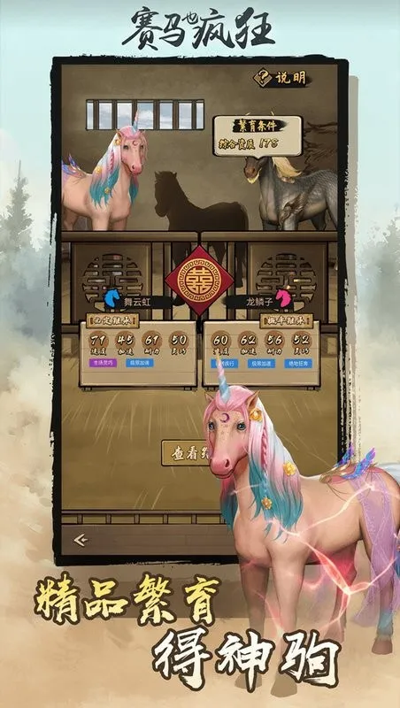 4、养成系统完善:提供喂食、洗刷、训练等多种养成操作,可提高马匹属性及品质,使其比赛更具优势。