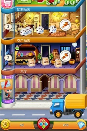 游戏画面精致细腻,人物形象Q萌可爱,采用竖版2D画面,以塔形楼层为背景,不同风格装修代表不同商店,方便玩家寻找选择。其玩法独特,玩家能修建精美商铺、豪华住宅,升级仓库收获金币,缔造商业帝国。